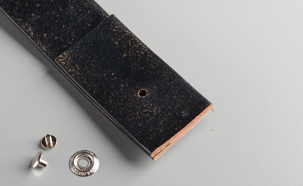 Поместите отрезанный кусок на ремень так, как показано на фото. Отверстие на отрезанном фрагменте укажет место, где нужно сделать прокол.