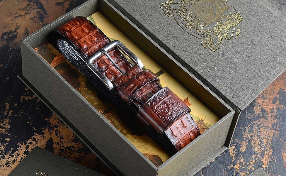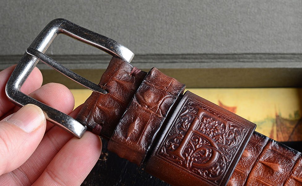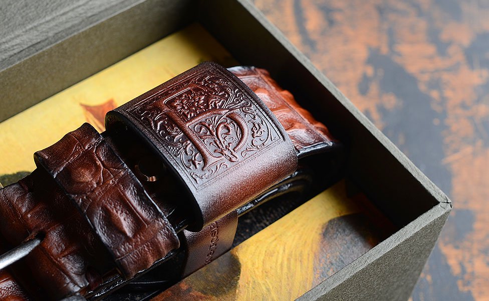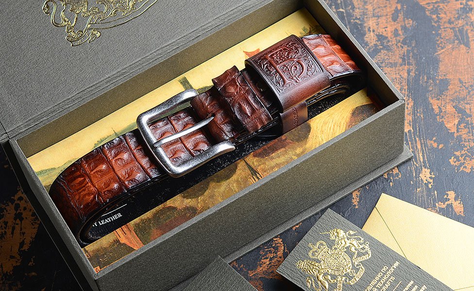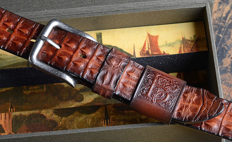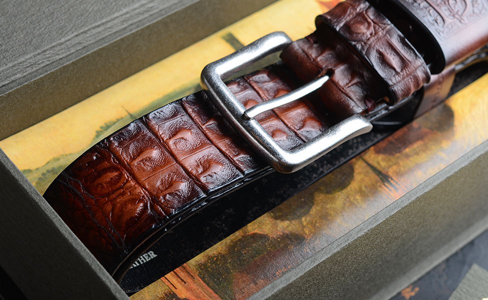 Глубокий коричневый оттенок и винтажная фактура крокодила делают этот ремень выразительным, но сдержанным. Универсальный выбор для тех, кто обращает внимание на детали — и подбирает их со вкусом.